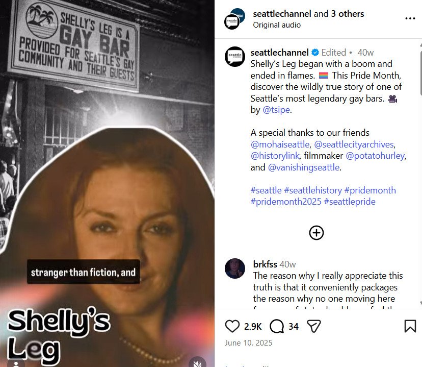 Planning is a big part of social media production. Some moments can’t be anticipated, but others are easier to build around, including heritage and history months like Pride. For this project, I highlighted the unbelievable true story of Shelly’s Leg, a short-lived but historic gay bar in Seattle’s original gayborhood, Pioneer Square.