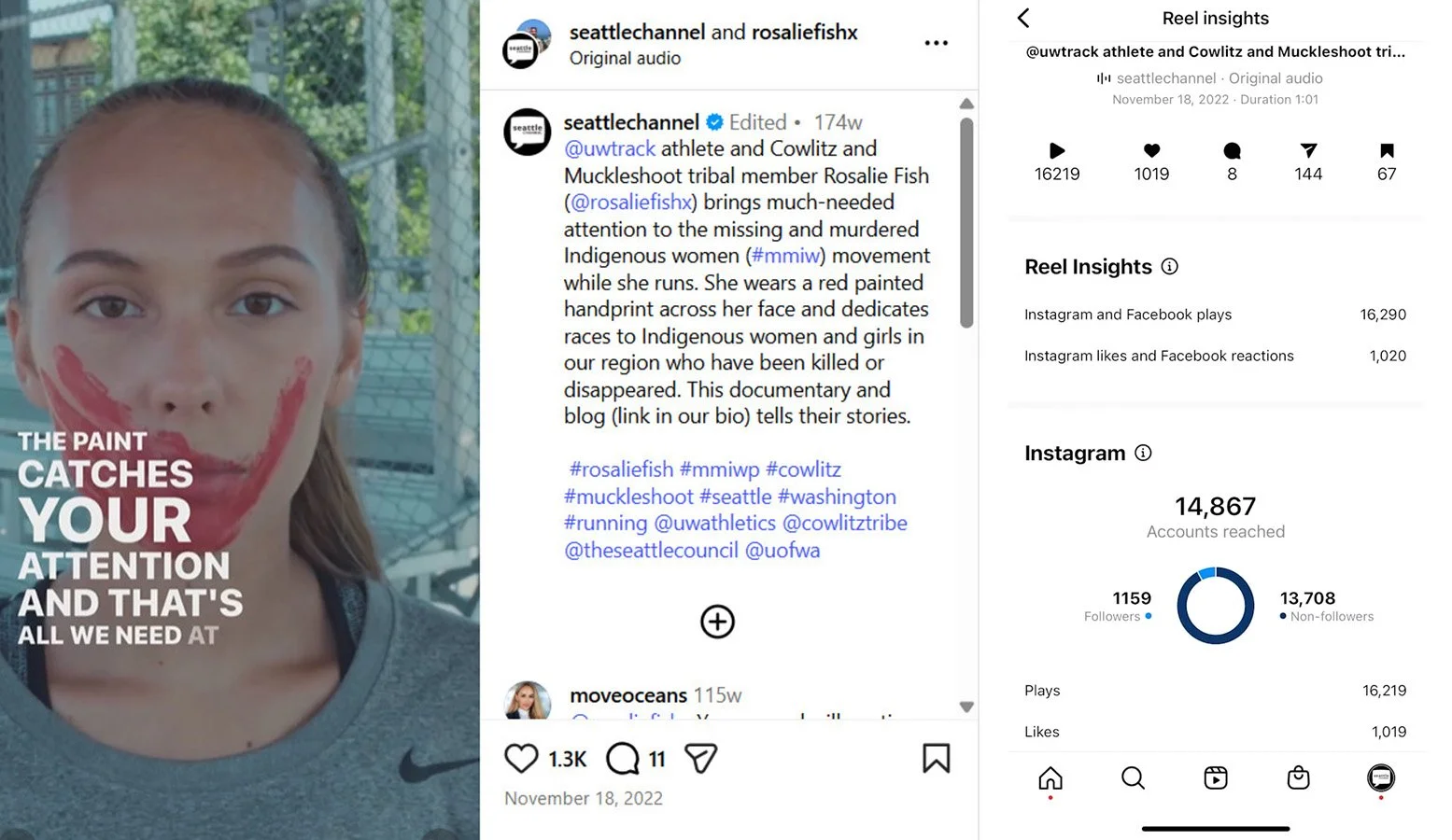The post performed especially well on Instagram, where it earned more than 16,000 views, and across platforms it brought in more than 1,300 likes, 150 shares, and clickthroughs to the full documentary. Beyond the numbers, what meant the most was seeing the piece continue to have a life after launch. The Tulalip Tribe used the video as an educational resource and aired it on its local channel.